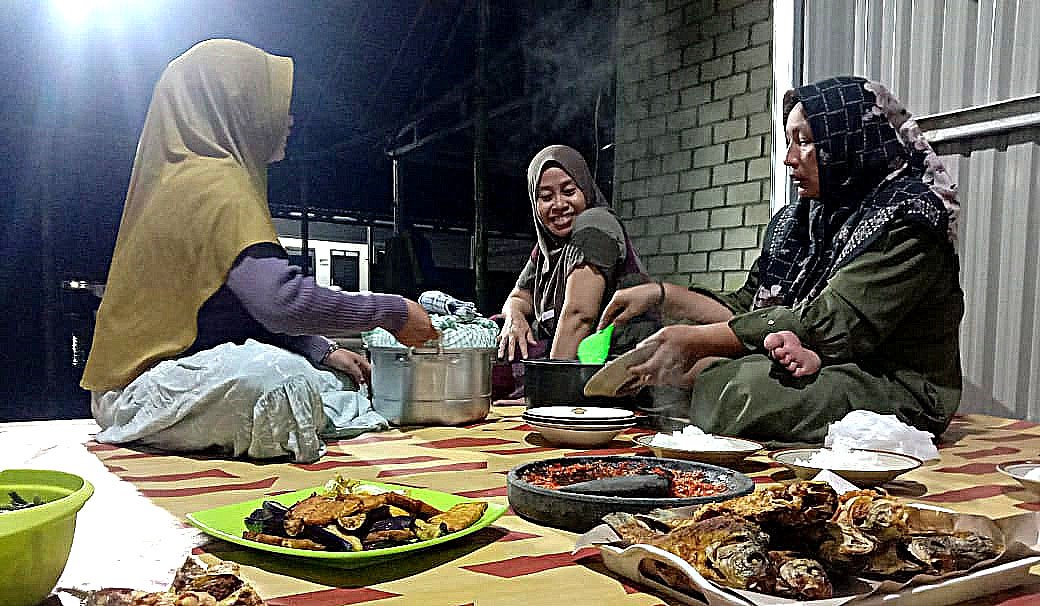 Namun salah satu emak-emak, yang mempersiapkan makanan dan sambal biasa mereka sebut Ibu Henny menjawab,”Walaupun sambalnya pedas, tapi menyayati (membuat ketagihan) pak ai,” sahutnya yang disambut gelak tawa oleh emak-emak dan bapak-bapak lainnya.